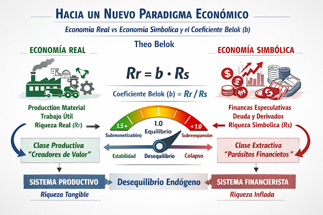 Lo que la teoría dominante ignora o minimiza es la expansión de la economía simbólica: el conjunto de representaciones de valor -dinero, crédito, bonos, acciones, derivados, títulos de deuda- cuyo crecimiento no está directamente anclado en la creación de riqueza real. Esta expansión no es neutral ni meramente instrumental; posee una lógica propia, autorreferencial y acumulativa. Expresan relaciones de poder extractivas, que generan explotación sistémica, ineficiencias, descoordinaciones y desequilibrios.